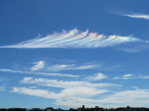 2010年7月18日 / Last updated : 2010年8月7日 admin 本日の風景 彩雲 (7月18日) 雲が虹みたいになっていました。 あとから調べてみたら「彩雲」というらしいです。 『彩雲は「よいことの前触れ」とも言われる。』そうです。 いいことがおこりますように!